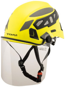 Zaštitni vizir koji pokriva cijelo lice • zaštita od čestica i tekućina • lako se pričvršćuje na utore na kacigi • beskonačno podesiv okretni gumb, vizir je prikladan i za ljude koji nose naočale • protiv magljenja • za višekratnu upotrebu (pranje i dezinfekcija) • certificiran za zaštitu od prskanja tekućina , primjeren za zaštitu od bioloških opasnosti